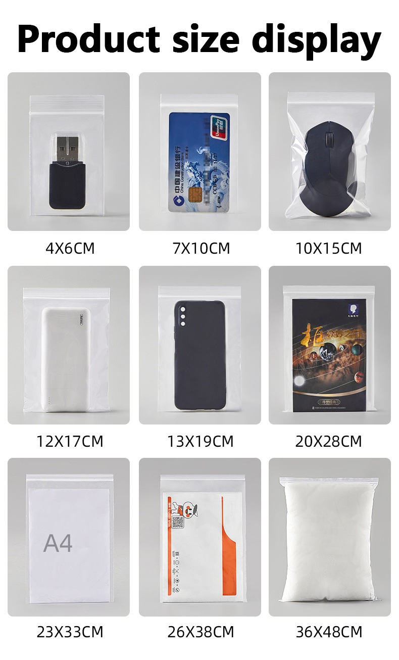 Застосування: пакети Ziplock, що закриваються, різних розмірів підходять для різних сфер, таких як зберігання, одяг, взуття, ювелірні вироби, медичні аксесуари, обладнання тощо.